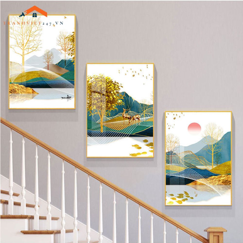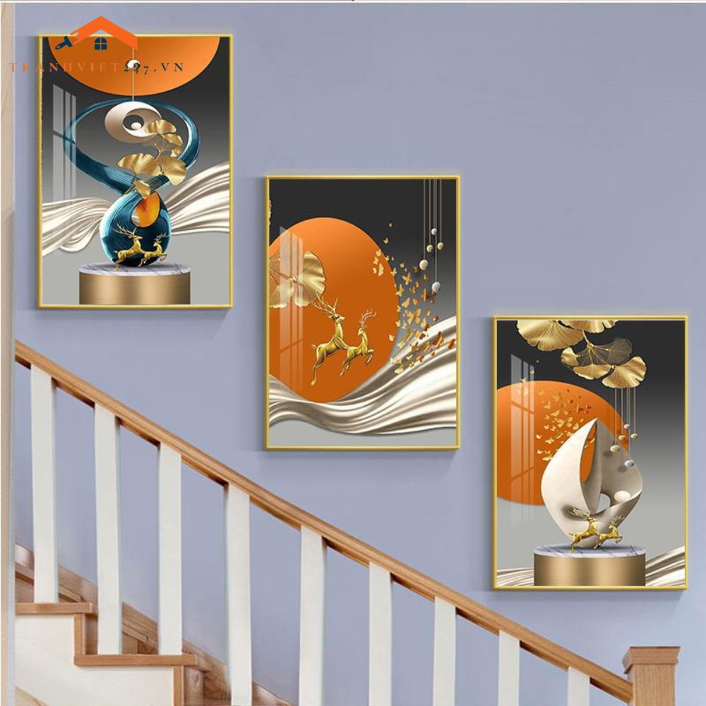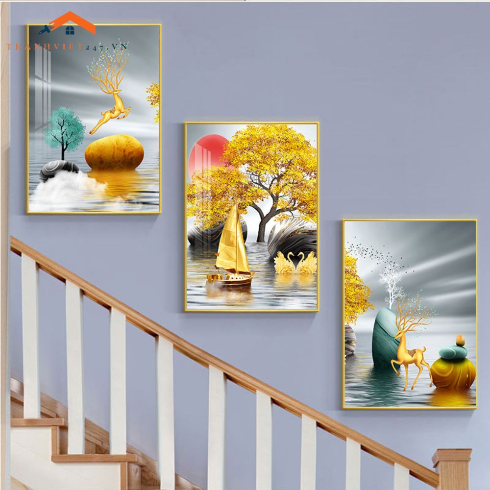Bộ Tranh Treo Tường Cầu Thang Hiện Đại Cây Vàng Hươu và Phụ Nữ Sang Trọng