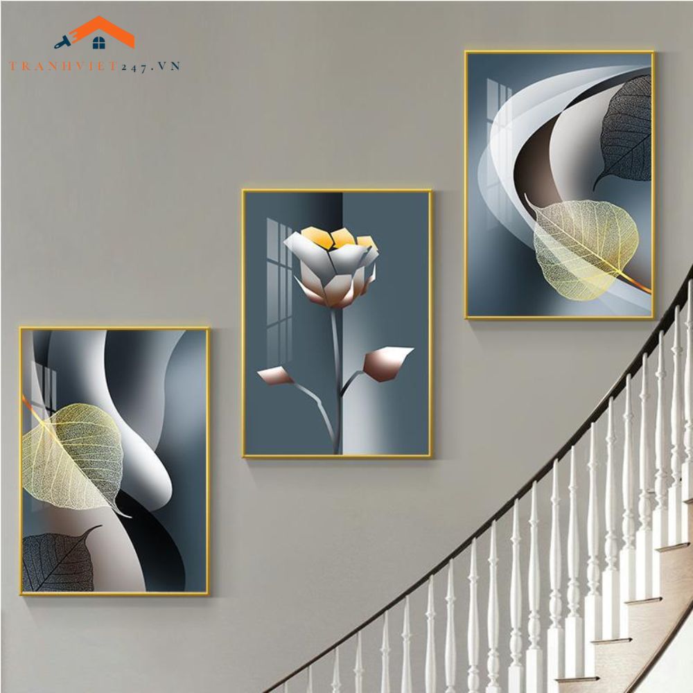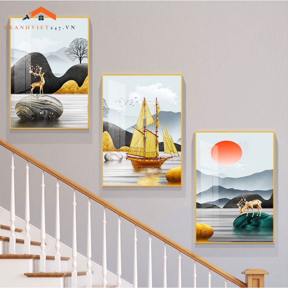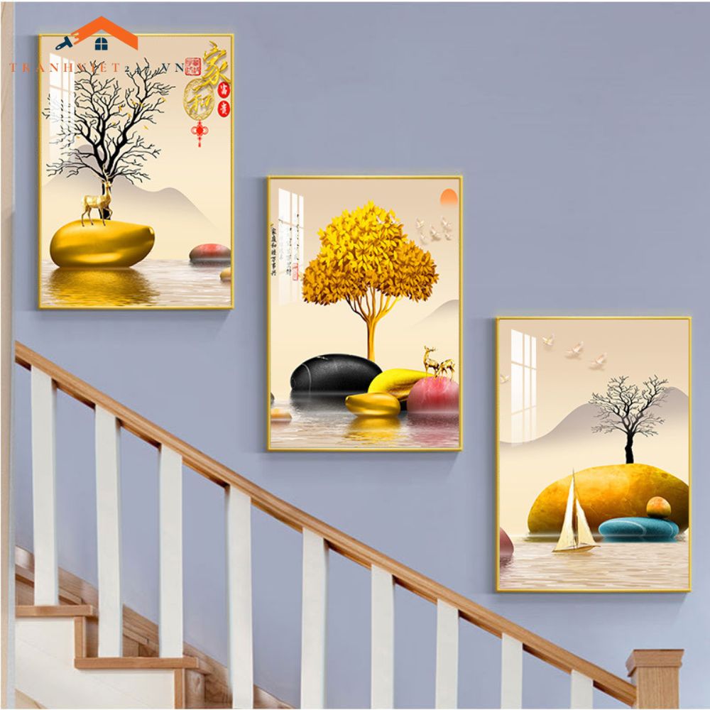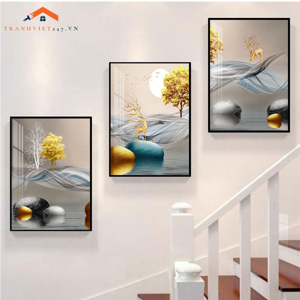 Bộ Tranh Treo Tường Cầu Thang Hiện Đại Cây Vàng Hươu và Phụ Nữ Sang Trọng