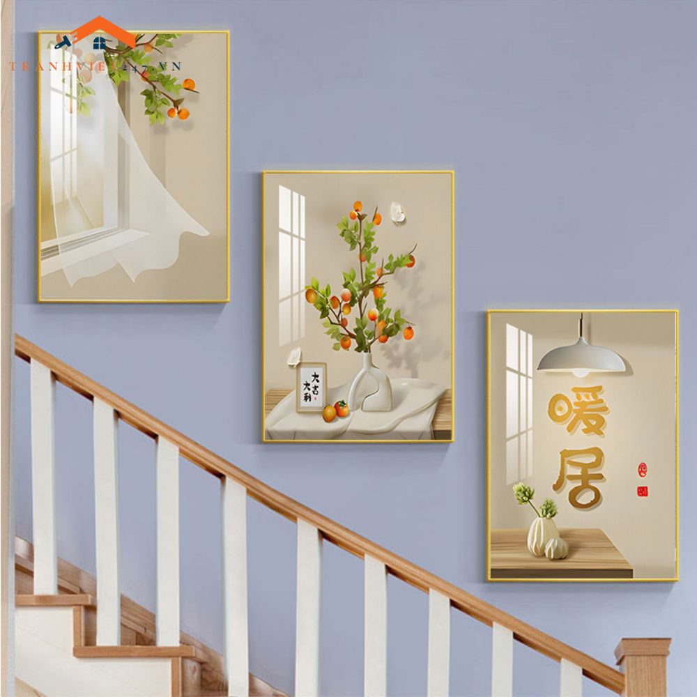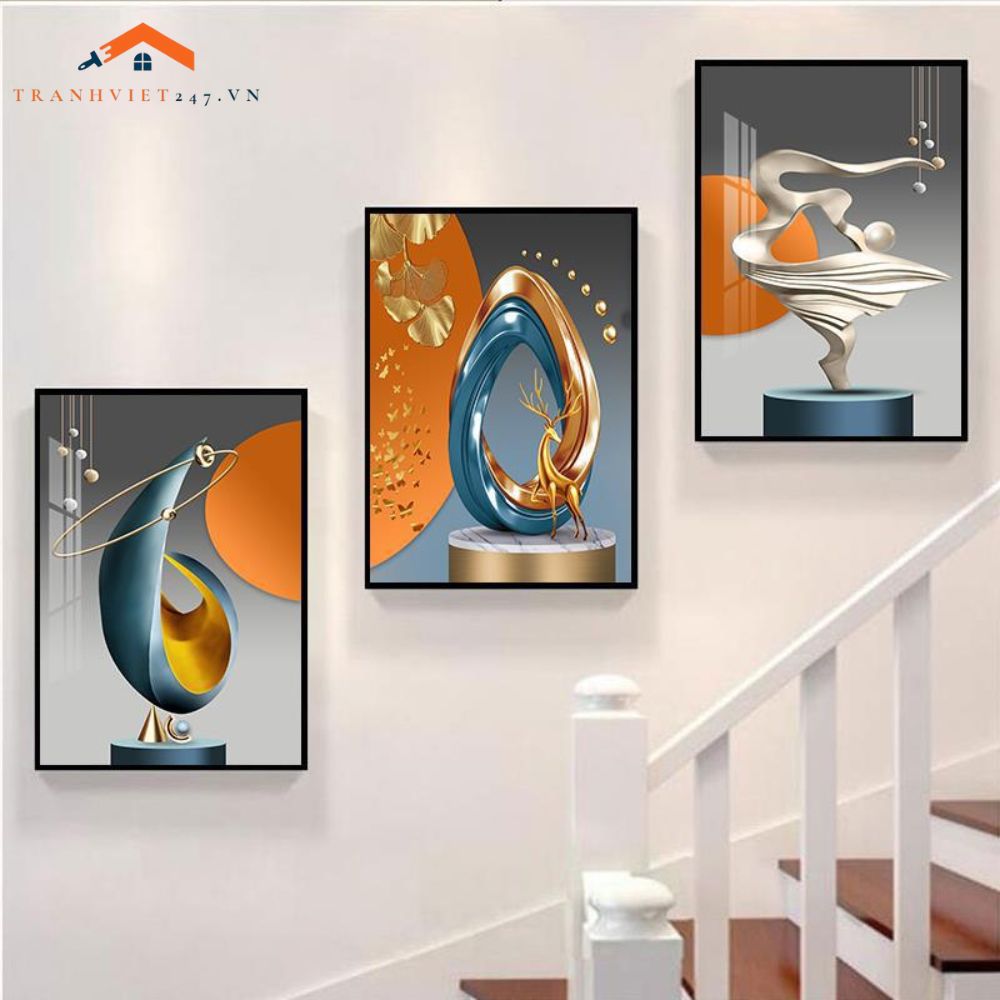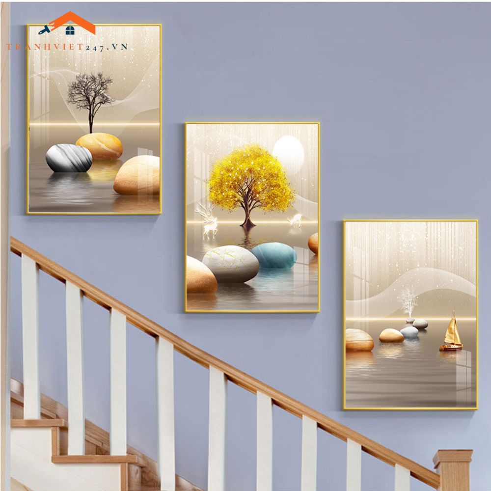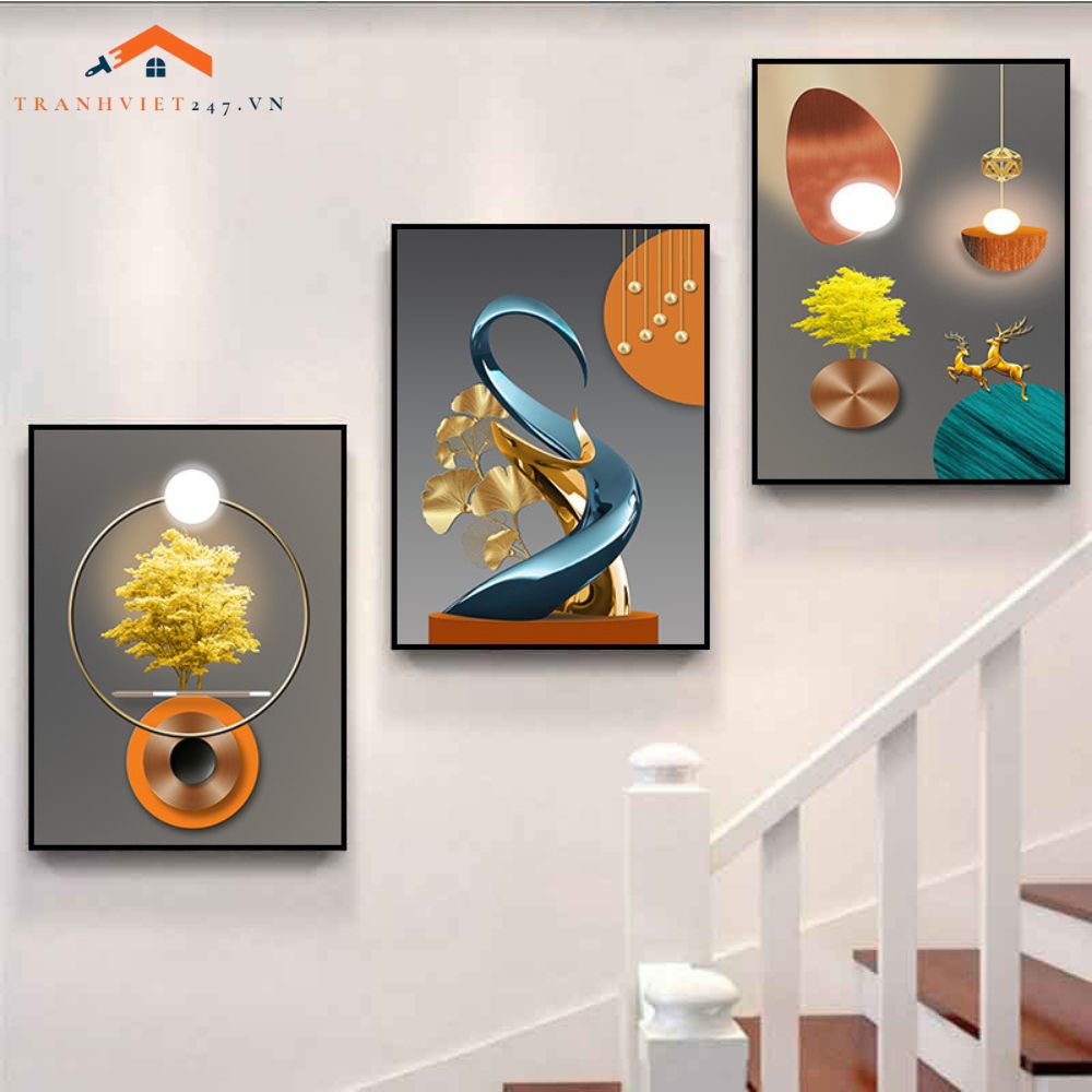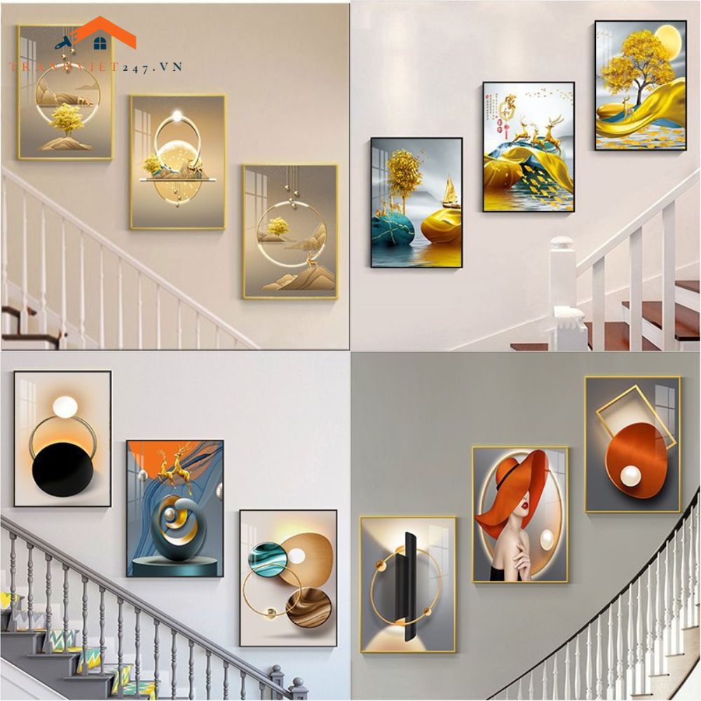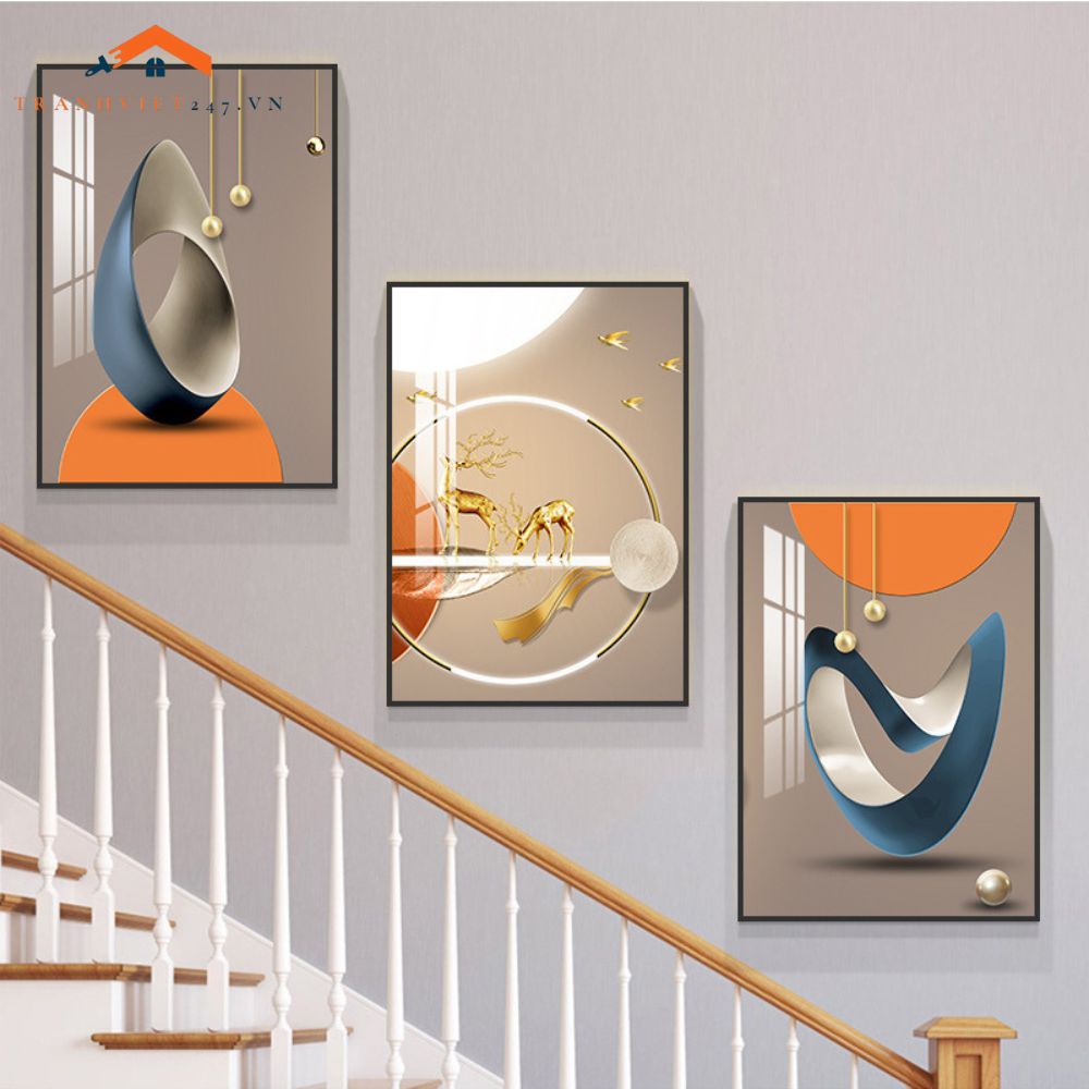 Bộ tranh treo tường cầu thang hiện đại từ Tranh Việt 247 là lựa chọn lý tưởng để làm đẹp không gian nội thất của bạn. Bộ tranh gồm bốn bức với các thiết kế đa dạng: từ hình ảnh cây vàng và hươu trên nền phong cảnh nước, đến hình ảnh phụ nữ đội mũ đỏ sang trọng, kết hợp với các yếu tố trừu tượng như vòng tròn ánh sáng và hươu vàng. Tông màu vàng, cam và xanh chủ đạo mang lại cảm giác ấm áp, hiện đại, rất phù hợp để trang trí khu vực cầu thang, phòng khách hoặc văn phòng.