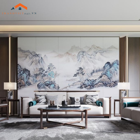 Tranh Dán Tường 3D Phong Cách Thủy Mặc Núi Non Hùng Vĩ