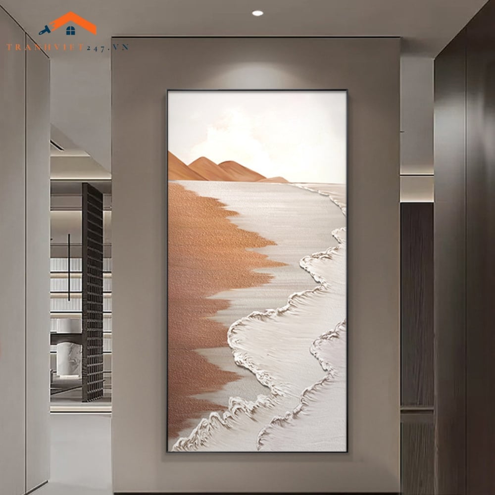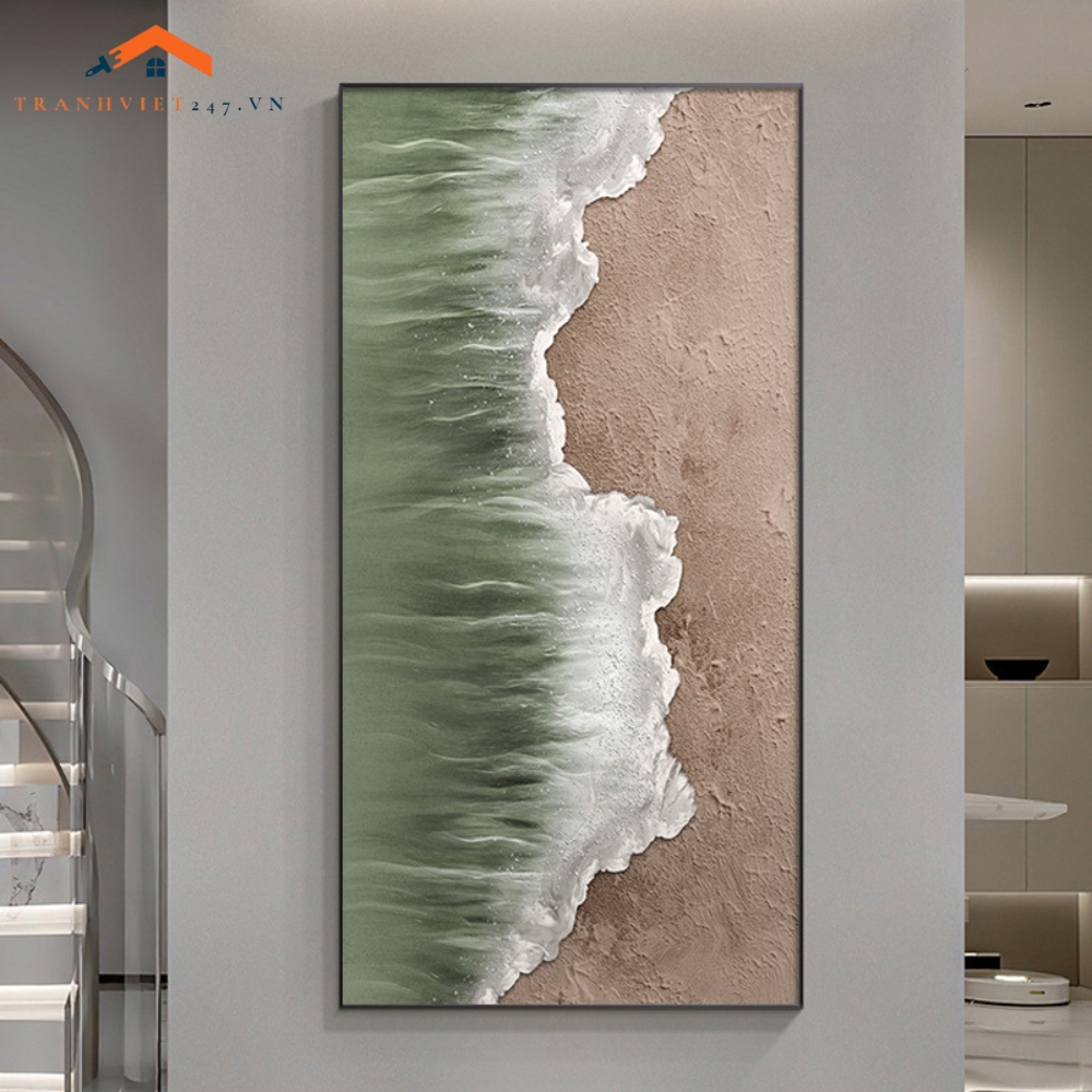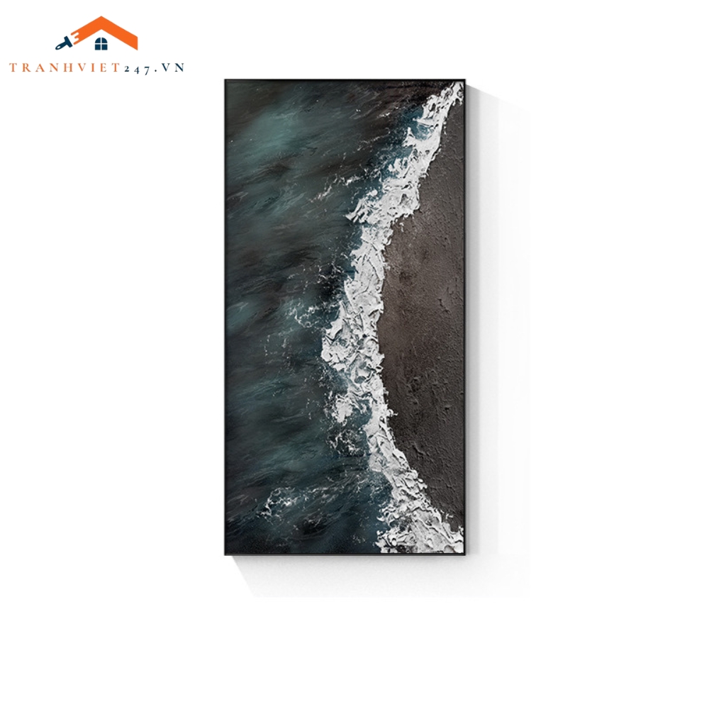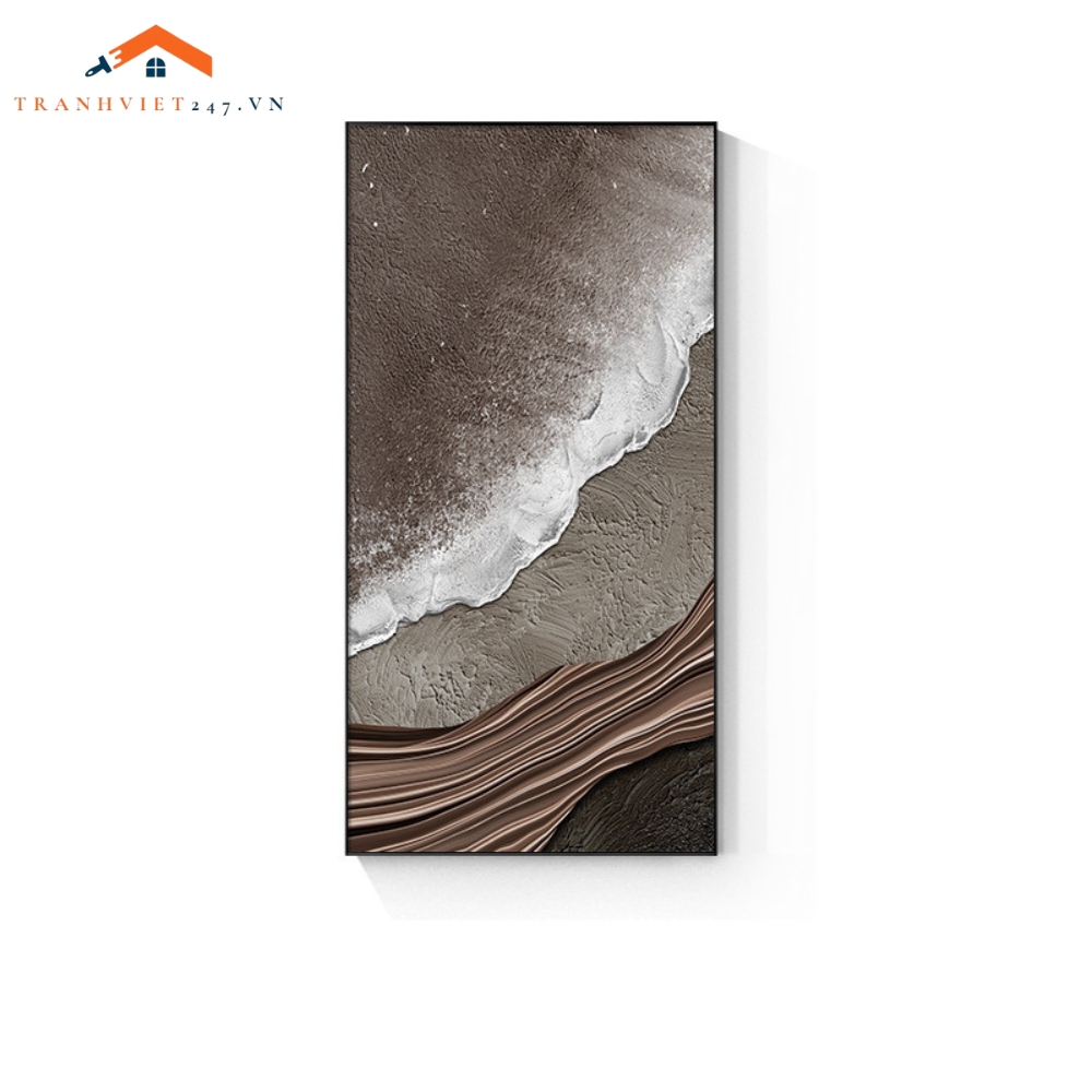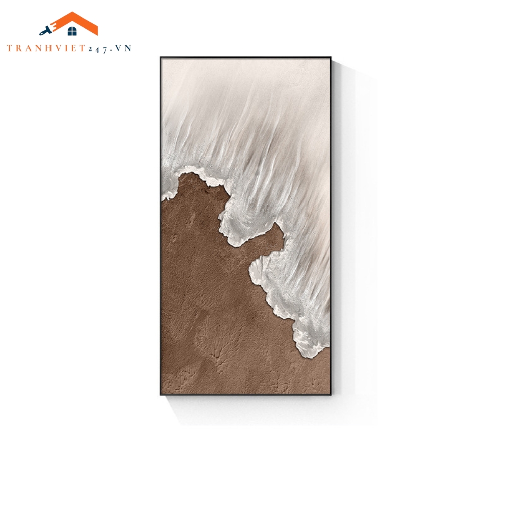 Bức tranh treo tường này mang đến một góc nhìn độc đáo về bờ biển, tái hiện sự giao thoa giữa bãi cát màu nâu ấm áp và làn nước biển xanh ngọc lam tươi mát. Những con sóng trắng xóa vỗ bờ tạo nên một đường ranh giới mềm mại và đầy sức sống. Hiệu ứng texture có thể được thể hiện trên cả bề mặt cát và sóng, mang đến cảm giác chân thực và chiều sâu cho tác phẩm. Bức tranh là sự kết hợp hài hòa giữa màu sắc tự nhiên và phong cách trừu tượng hiện đại, phù hợp với nhiều không gian nội thất.
